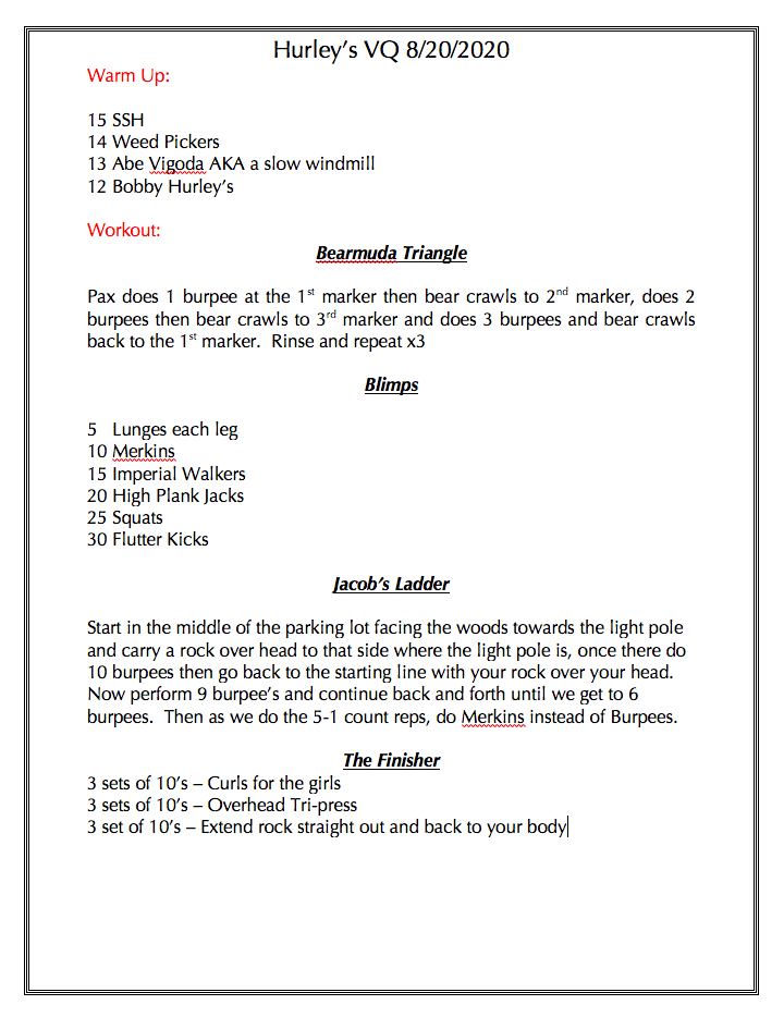 YHC Q #5 of a week of Qs The Thang: 4 Corners ~30 Yards apart Station 1: 5 Burpees, Broad Jump to Second Cone Station 2: 5 Burpees, 10 Squat…