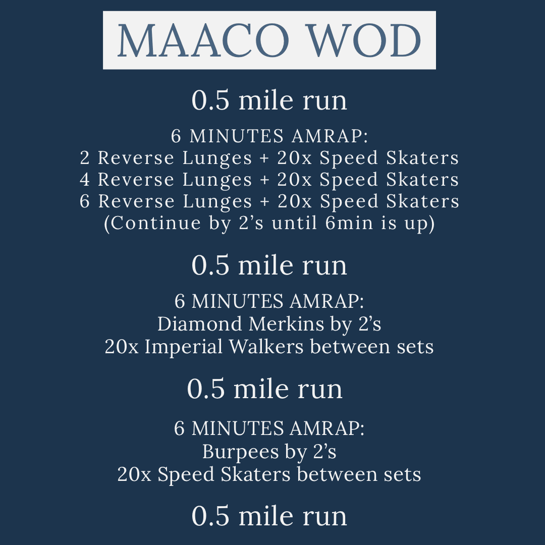 Warmarama Mosey to Amphitheater SSHs, Imperial Walkers, Wind Mills, WeedPickers Half a Burp Back Mountain Partner Up. P1 runs backwards up the hill, then forwards down the hill for one…