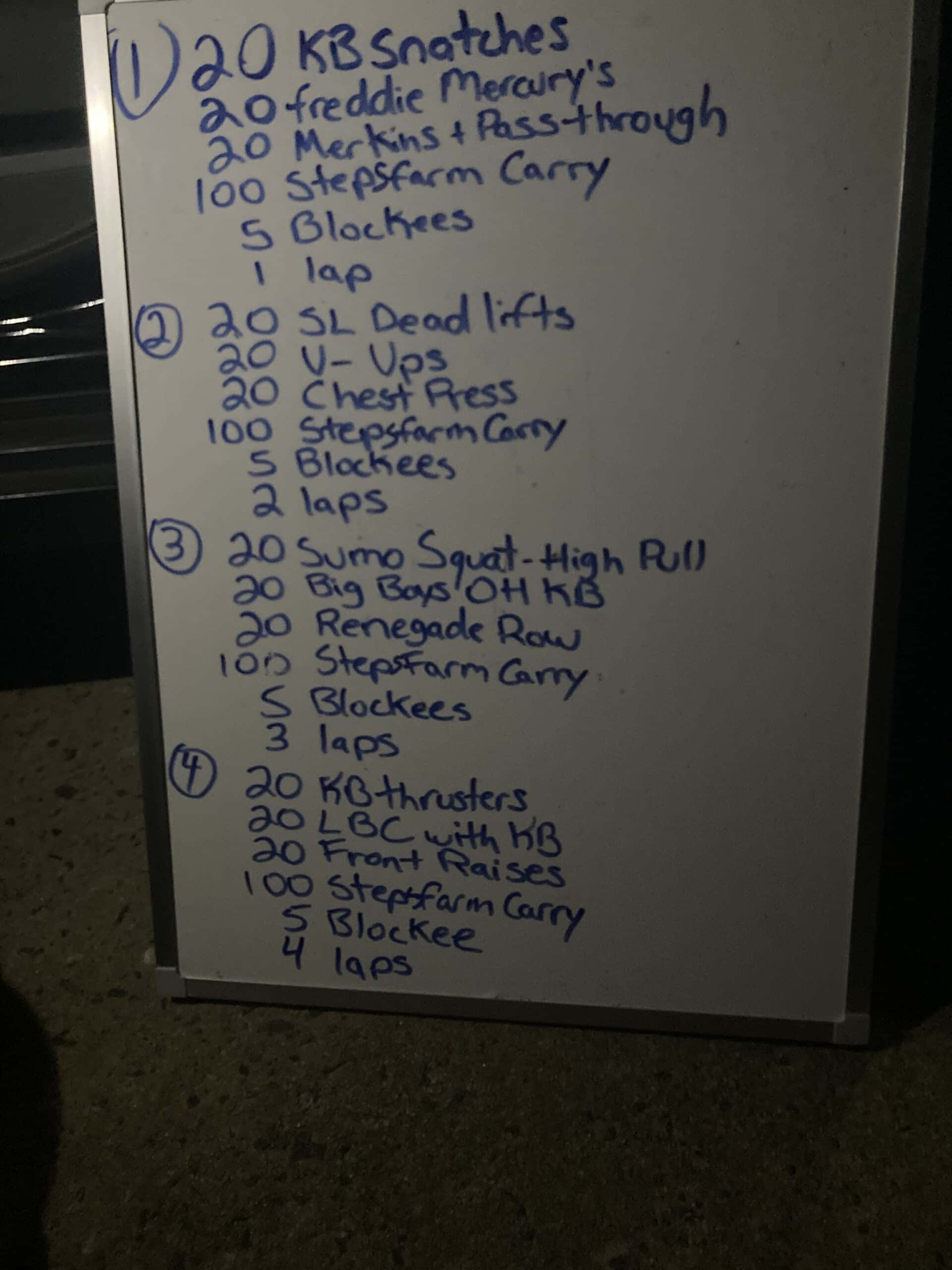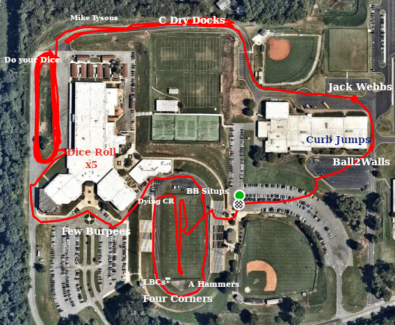 Warmorama: Short mosey to grass in front of FMS. Count off. Namorama (despite Grylls’ protestations). SSH’s; Imperial Walkers, Mummy Kicks, Weed Pickers, air press, sun gods, phelps The Thangs: Triple…