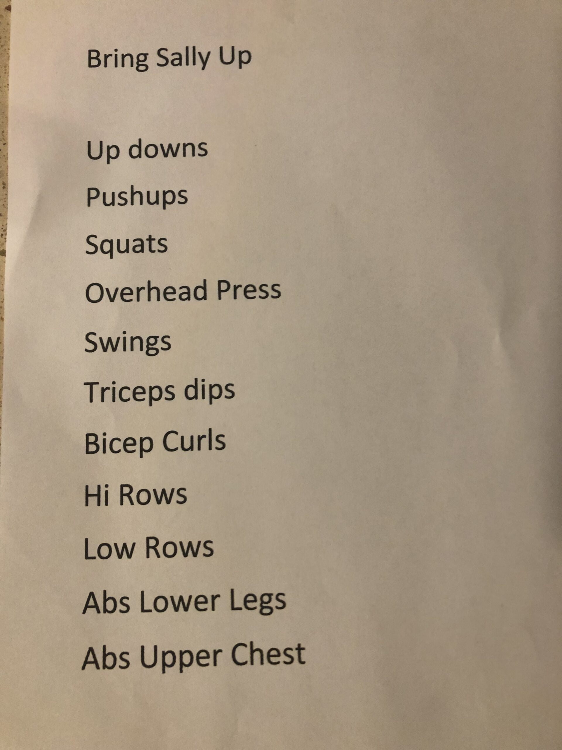 Quick mosey, stretch, Bring Sally up with