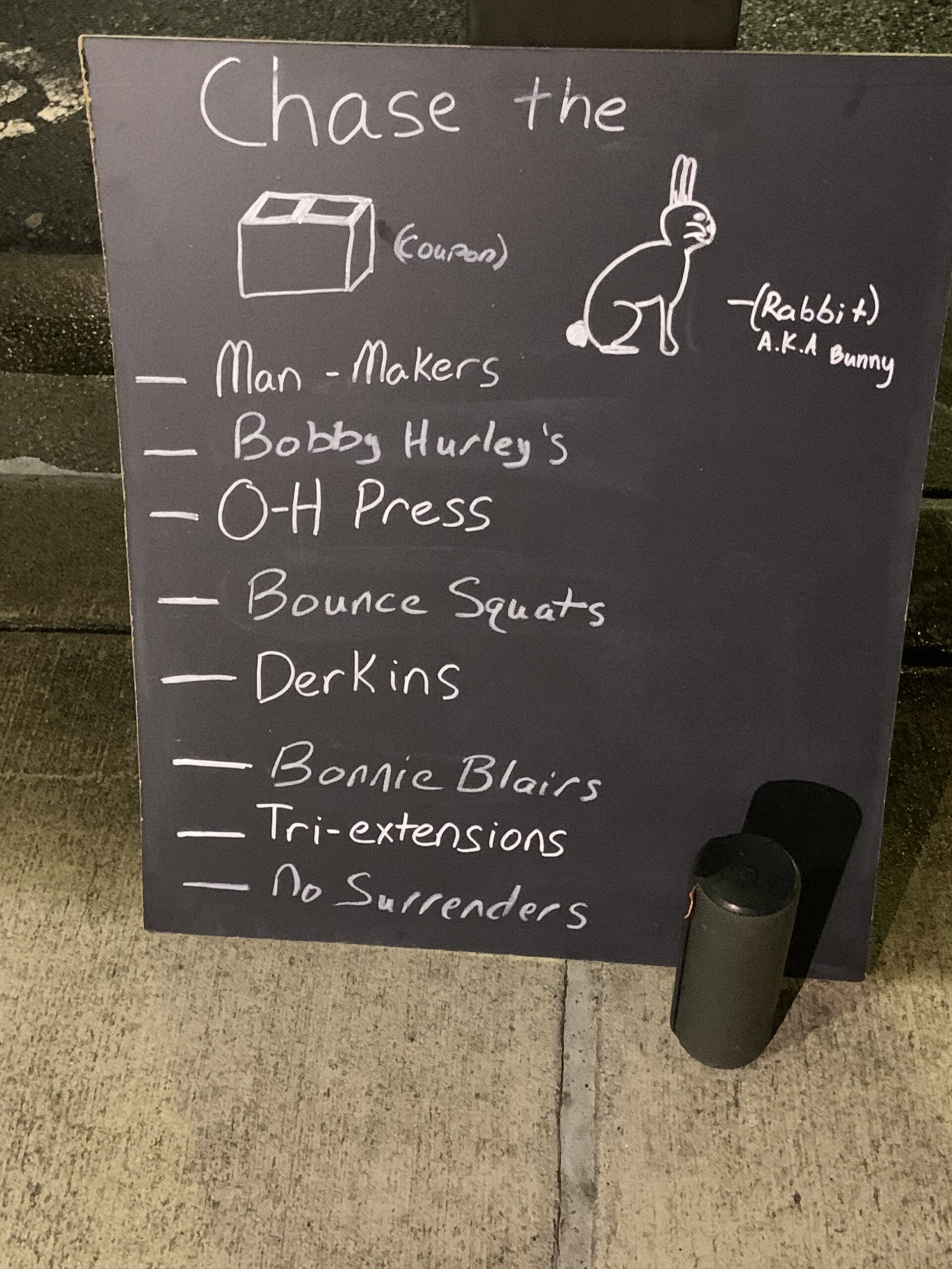 Quick warm-o-Rama, had to get busy chasing the rabbit! Chase the Rabbit is a good mix of cardio and various exercises. Throw a coupon in there and it just sucks!…