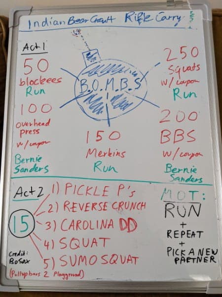 Mosey – Indian run (1 lap) Warmarama: Ssh 15, WP 10, IW 15, MP/SG, 10 burpees OYO Short Mosey & halt. Time for some Indian bear crawls. PAX hold plank…