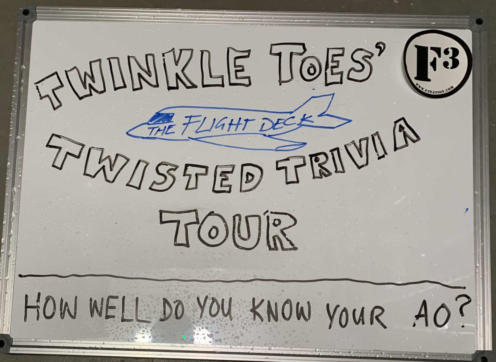 Warm-O-Rama: Mosey SSH Weedpickers Imperial Walkers SunGods Arm Pretzels Michael Phelps The Thang: A Pearls-on-String beatdown set up around a series of trivia questions. The general theme was “How well…