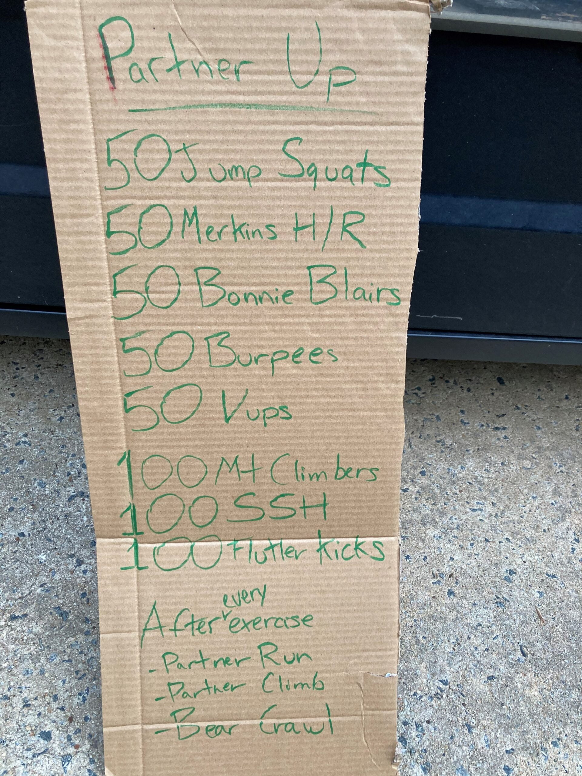 We had a guest from F3 Atlanta – Purple Cow. Started out with a few weed pickers, sun gods, side straddle hops and some other things. Then the partner leg…